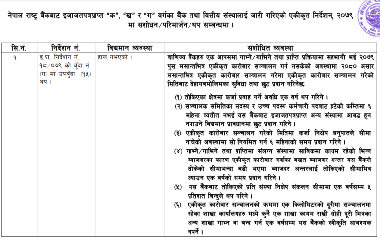 राष्ट्र बैंकबाट तोकिएको प्रतिसंस्था निक्षेप संकलन सीमामा १ वर्षसम्म ५५ विन्दुले थप गरिने व्यवस्था संशोधित निर्देशनमा गरिएको छ। एकीकृत कारोबार सञ्चालनका क्रममा एक किलोमिटरको दूरीमा सञ्चालनमा रहेका शाखा कार्यालयमध्ये कुनै एक शाखा कायम राखी सोही दूरीभित्रका अन्य शाखा गाभ्न वा बन्द गर्न १ वर्षसम्म राष्ट्र बैंकको स्वीकृति आवश्यक नपर्ने व्यवस्था पनि निर्देशनमा गरिएको छ।