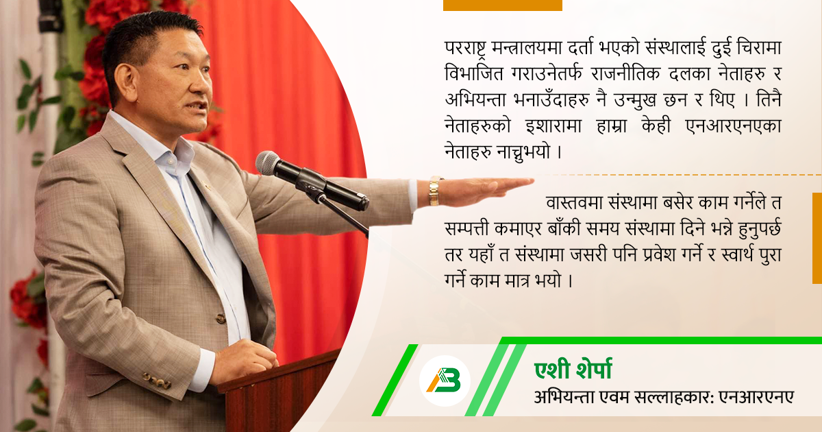 एनआरएनए हामी सबै प्रवासी नेपालीहरुको साझा र पवित्र संस्था हो । यो संस्था जुन गतिमा जानुपर्ने थियो, गएन । १०औं सम्मेलन हुनुपूर्व एनआरएनएका नेताहरुले गरेका गैरजिम्मेवार गतिविधिले अहिलेको अवस्थामा पुगेको हो । त्यो सम्मेलनअघि संस्था दुई टुक्रा हुन्छ भन्नेमा मलाई पहिल्यै थाहा थियो । परराष्ट्र मन्त्रालयमा दर्ता भएको संस्थालाई दुई चिरामा विभाजित गराउनेतर्फ राजनीतिक दलका नेताहरु र अभियन्ता भनाउँदाहरु नै उन्मुख छन र थिए । तिनै नेताहरुको इशारामा हाम्रा केही एनआरएनएका नेताहरु नाच्नुभयो । परराष्ट्रमार्फत नै संस्थाको समस्या हल गर्नुपर्नेमा तत्कालीन प्रधानमन्त्री र नेताहरुले संस्था विभाजनमा लैजानुभयो ।