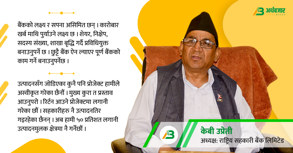 उत्पादनसँग जोडिएका कुनै पनि प्रोजेक्ट हामीले अस्वीकृत गरेका छैनौं । मुख्य कुरा त प्रस्ताव आउनुपरो । रिर्टन आउने प्रोजेक्टमा लगानी गरेका छौं । सहकारीहरु नै उत्पादनतिर गइरहेका छैनन् । अब हामी ५० प्रतिशत लगानी उत्पादनमुलक क्षेत्रमा नै गर्नेछौं । उत्पादन क्षेत्रमा गएकाहरुलाई वित्तिय समस्या पनि आएको छैन । तरलताको अभाव छैन । बचत ऋण दिएर भएपनि उत्पादन क्षेत्रमा काम गर्ने लक्ष्य छ । नाम अनुसार काम गर्ने लक्ष्य छ । कोपोमिसका क्षेत्रमा पनि बेग्लै रुपमा काम गरिरहेका छौं । यसमा सबैभन्दा धेरै योगदान हाम्रै होला । यसलाई परिमार्जन गर्नुपर्ने बाध्यता चाहीं छ । लगानीको सवालमा डाटा संकलन आवश्यक देखिएको छ ।