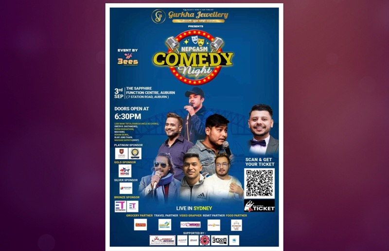 काठमाडौं । अष्ट्रेलियाको सिड्नीमा नेपग्याजम कमेडी नाईट आयोजन हुने भएको छ । आगामी सेप्टेम्बर ३ मा सिड्नीको अबर्नस्थित सफायर फंसन सेन्टरमा थ्री बिज इन्टरटेन्मेन्टले नेपग्याजम कमेडी नाईट आयोजना गर्न लागेको हो ।