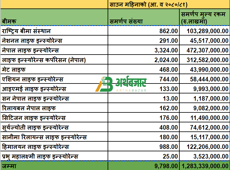 साथै, बीमितहरुले हिमालयन लाइफ इन्स्यारेन्सको १२ करोड २२ लाख ६ हजार रुपैंयाको नौं सय ८८ वटा बीमालेख सरेण्डर भएका छन् । राष्ट्रिय बीमा संस्थानको १० करोड ३२ लाख ८९ हजार रुपैंयाको आठ सय ६२ वटा बीमालेख सरेण्डर भएका छन् । त्यस्तै, एशियन लाइफ इन्स्योरेन्स कम्पनीको सात सय ४४ वटा, मेट लाइफको चार सय ६८ वटा, सुर्यज्योती लाइफ इन्स्याेरेन्सकाे ४०८ वटा, नेशनल लाइफको दुई सय ९१ वटा, रिलायबल नेपाल लाइफको एक सय ६२ वटा, सानिमा रिलायन्स लाइफको १८० वटा, सिटिजन लाइफ इन्स्योरेन्सको एक सय ७६ वटा, आइएमई लाइफ इन्स्योरेन्सको १३३ वटा, प्रभु महालक्ष्मी लाइफ इन्स्योरेन्सको २५ वटा पोलिसी सरेण्डर भएका छन् ।