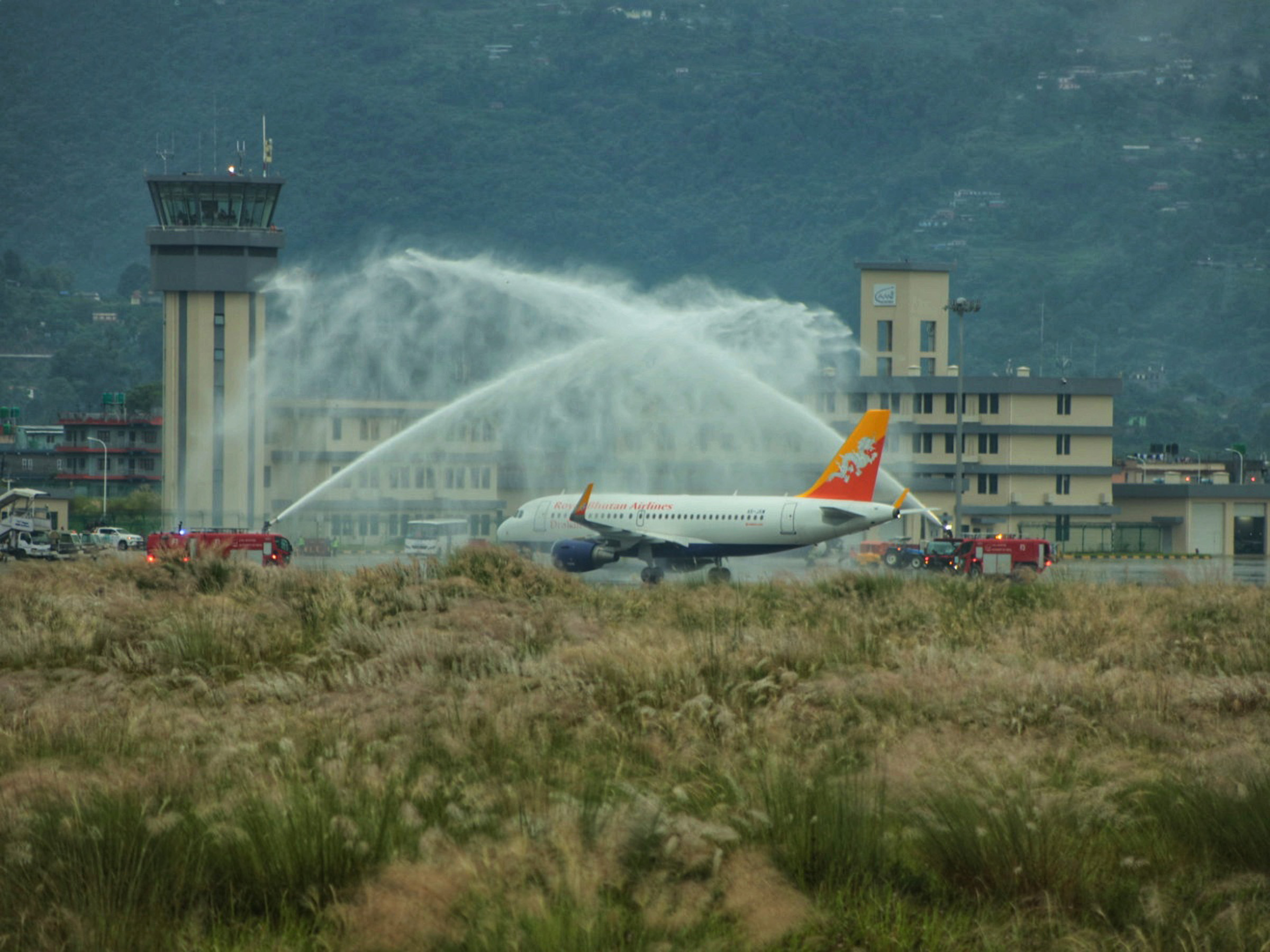 भुटानबाट आएको ड्रुक एयर पोखरा अन्तर्राष्ट्रिय विमानस्थलमा अवतरणका क्रममा शनिबार बिहान पानीको फोहोराले स्वागत गरिँदै । तस्बिरः राधिका कँडेल/रासस