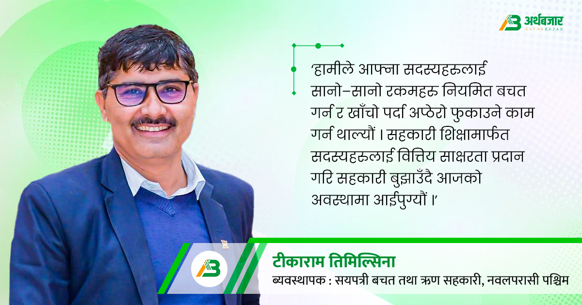 देशमा भर्खरै सहकारीहरु खुल्ने क्रम थियो । समाजमा चर्कोब्याजमा सानो रमकहरु पनि सयकडा पाँच रुपंैयाँसम्म तिर्न मानिसहरु बाध्य थिए । पैसा जम्मा गर्न सिकाउने पर्याप्त वित्तिय संस्थाहरु यस क्षेत्रमा थियनन् । हामीले आफ्ना सदस्यहरुलाई सानो सानो रकमहरु नियमित बचत गर्न र खाँचो पर्दा अप्ठेरो फुकाउने काम गर्न थाल्यौं । सहकारी शिक्षामार्फत सदस्यहरुलाई वित्तिय साक्षरता प्रदान गरि सहकारी बुझाउँदै आजको अवस्थामा आईपुग्यौं ।