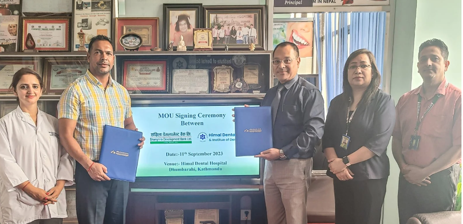 काठमाडौँ । सांग्रिला डेभलपमेन्ट बैंक लिमिटेड र हिमाल डेन्टल हस्पिटलबीच बैंकका ग्राहक महानुभाव तथा बैँकका कर्मचारीलाई विभिन्न किसिमका डेन्टल सेवा प्रदान गर्ने उद्देश्यले सम्झौता पत्रमा हस्ताक्षर भएको छ ।