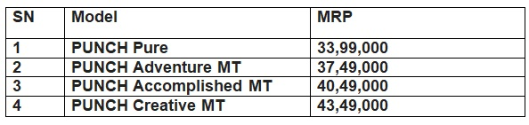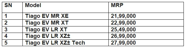 त्यसैगरी, टाटाको “न्यु फरेभ” रेन्जअन्तर्गतको टाटा पन्चको चार आधार स्तम्भहरु हुन् आकर्षक डिजाइन, विशेष कार्यक्षमता, फराकिलो इन्टेरिएर र पूर्ण सुरक्षा रहेका छन्। नयाँ युग सुहाउँदो सोच र प्रविधिमा आधारित यो गाडीले ग्राहकहरुको बदलिदो इच्छा एवं आकांक्षाहरुको परिपूर्ति गर्दछ। टाटा पन्च हाल भारतीय बजारमा सबैभन्दा बढी विक्री भइरहेको सब कम्प्याक्ट एसयूभी रुपमा पनि परिचित छ। टियागो ईभीको बजार मूल्य यसप्रकार रहेको छ।