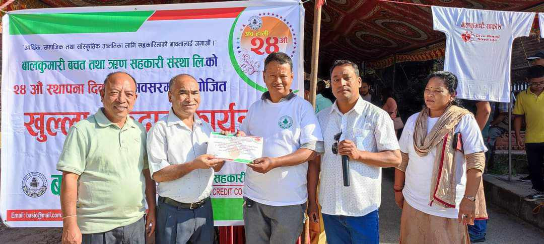 काठमाडाै । बालकुमारी बचत तथा ऋण सहकारी संस्थाले स्थापना दिवसको अवसरमा खुल्ला रक्तदान कार्यक्रम आयोजना गरेको छ । संस्थाले २४ औं स्थापना दिवसको अवसरमा रक्तदान गरेको हो । मध्यपुर थिमि–४ शंखधर चोकमा आयोजना भएकाे रक्तदान कार्यक्रममा १ सय ४ जनाले रक्तदान गरेको संस्थाले जनाएको छ ।
