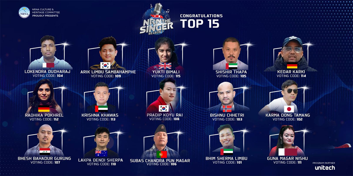 गैरआवासीय नेपाली संघ (एनआरएनए)को संस्कृति तथा सम्पदा समितिको संयोजन र युनिटेक नेपालले व्यवस्थापनमा उत्पादन गरिएको कार्यक्रममा अब उत्कृष्ट १५ बाट १२ जना छनोटका लागि भोटिङ खुला गरिएको छ । त्यसका लागि खल्ति एपसँग सहकार्य गरिएको युनिटेकका कार्यक्रम उत्पादक सुरज राइले जानकारी दिए । भोटिङका लागि अक्टोबर १ अपरान्ह ५ बजेसम्मको लागि समय दिइएको छ ।