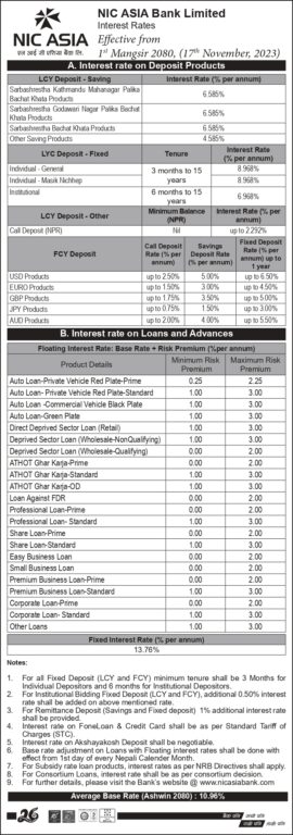 काठमाडौं । एनआइसी एसिया बैंकले मंसिर महिनाका लागि ब्याजदरमा भारी कटौती गरेको छ । एनआइसीले व्यक्तिगत मुद्दति निक्षेपमा अब अधिकतम जम्मा ८.९६८ प्रतिशतमात्र ब्याज दिने भएको हो ।