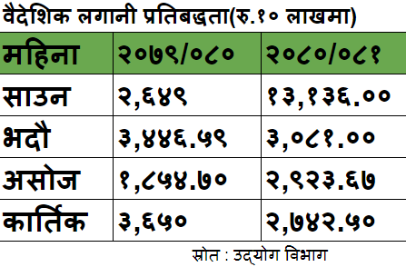 विभागका अनुसार कात्तिकका मात्रै दुई अर्ब ७४ करोड २५ लाखबराबरको लगानी प्रतिबद्धता आएको छ । विभागका अनुसार कात्तिकमा २७ वटा नयाँसहित ४२ वटा उद्योगमा वैदेशिक लगानी प्रतिबद्धता आएको हो। सबैभन्दा बढी लगानी प्रतिबद्धता पर्यटनसम्बन्धी उद्योगमा आएको छ । वैदेशिक लगानी प्रतिबद्धतामध्ये सबैभन्दा धेरै पर्यटन क्षेत्रमा देखिएको छ । चालु आवको चार महिनामा कुल लगानी प्रतिबद्धताको ४८ प्रतिशत हिस्सा पर्यटन क्षेत्रको छ ।