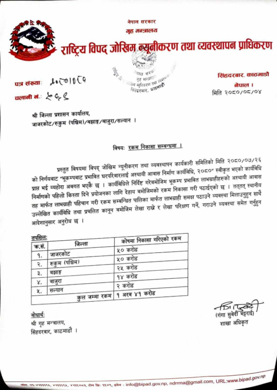 जाजरकोट र पश्चिम रुकुमका लागि ५०-५० करोड, बझाङका लागि २५ करोड, बाजुराका लागि १४ करोड र सल्यानका लागि दुई करोड गरी जम्मा एक अर्ब ४१ करोड निकासा भएको हो। प्राधिकरणले निकासाबारेको बोधार्थ गृह मन्त्रालयमा पठाएको छ।